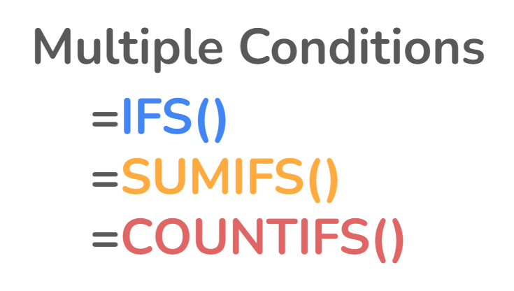 ยกตัวอย่างฟังก์ชั่น IFS เราสามารถกรองข้อมูลได้มากกว่า 1 เงื่อนไข COUNTIFS นับจำนวนตามเงื่อนไขต่างๆที่เรากำหนดขึ้นได้ SUMIFS หาผลรวมตามเงื่อนไขต่างๆ ส่วนมาก Multiple Conditions IFs สามารถใช้ร่วมกับพวก Logical Operator (AND, OR, NOT) เพื่อเพิ่มเงื่อนไขที่ซับซ้อนมากขึ้นได้