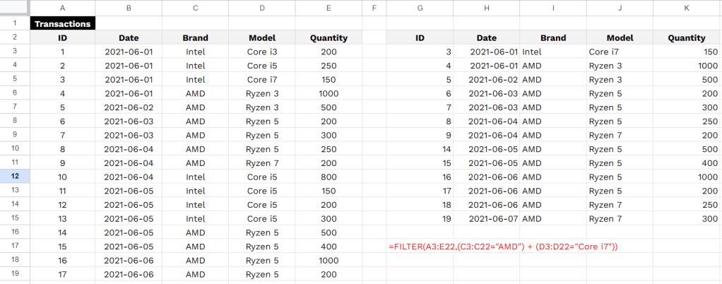 =FILTER(A3:E22,(C3:C22="AMD") + (D3:D22="Core i7"))