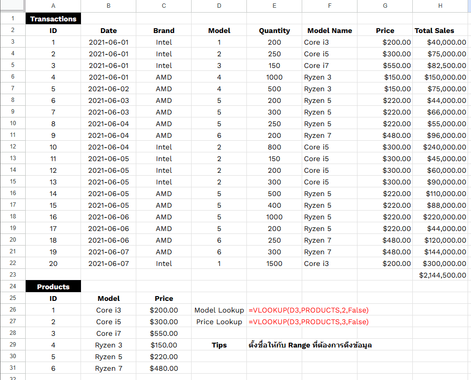 ** VLOOKUP(ค่าที่ต้องการหา, ขอบเขตข้อมูลที่ต้องการเปรียบเทียบ, คอลัมธ์ที่ต้องการให้แสดงผล, ต้องการให้ข้อมูลตรงทุกตัวอักษร)