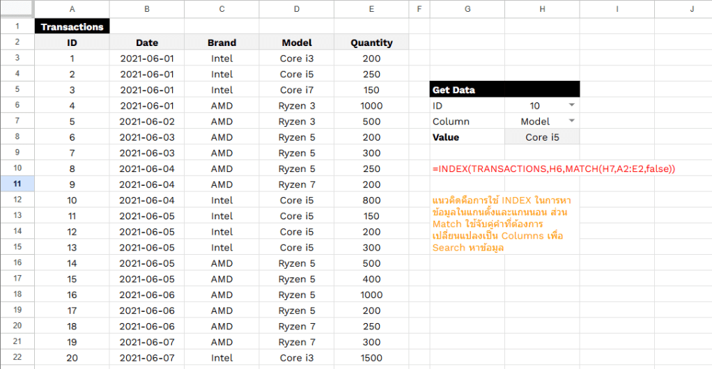ตัวอย่างข้างล่างคือประยุกต์ใช้ Index และ Match นำตัว Dropdown List มาใช้ เพื่อทำการหาข้อมูลที่เป็น Dynamic Table นำ Match Function เข้าเพื่อให้ส่งคืนค่ากลับมาเป็นตำแหน่งของ Columns